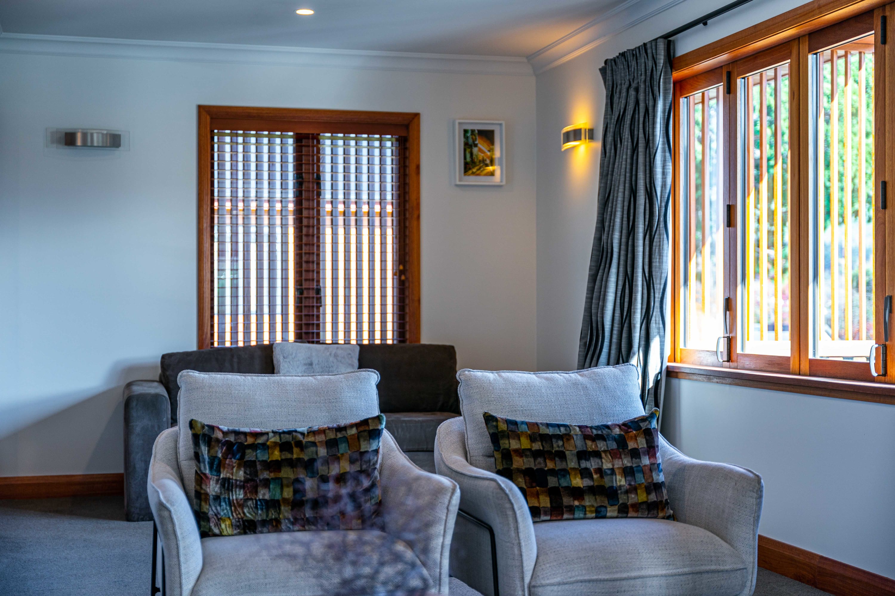 As soon as you step into the lounge, you'll be greeted with a warm and inviting atmosphere with uninterrupted views. The interior is meticulously crafted with contemporary furnishings and state-of-the-art amenities to provide a luxurious living experience. The living room features large windows that offer panoramic views of the mountains and lake, as well as comfortable seating arrangements perfect for lounging and socialising.