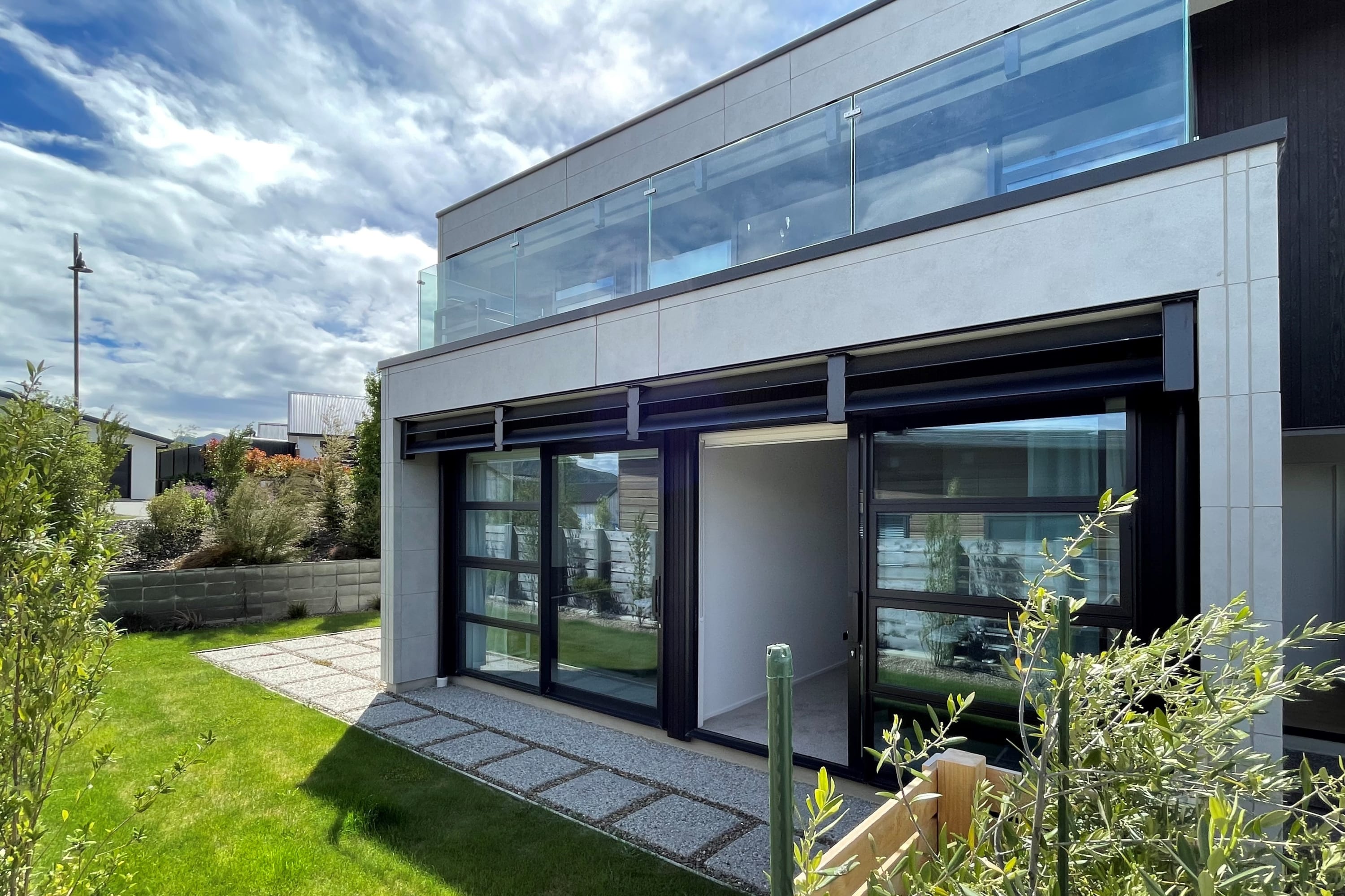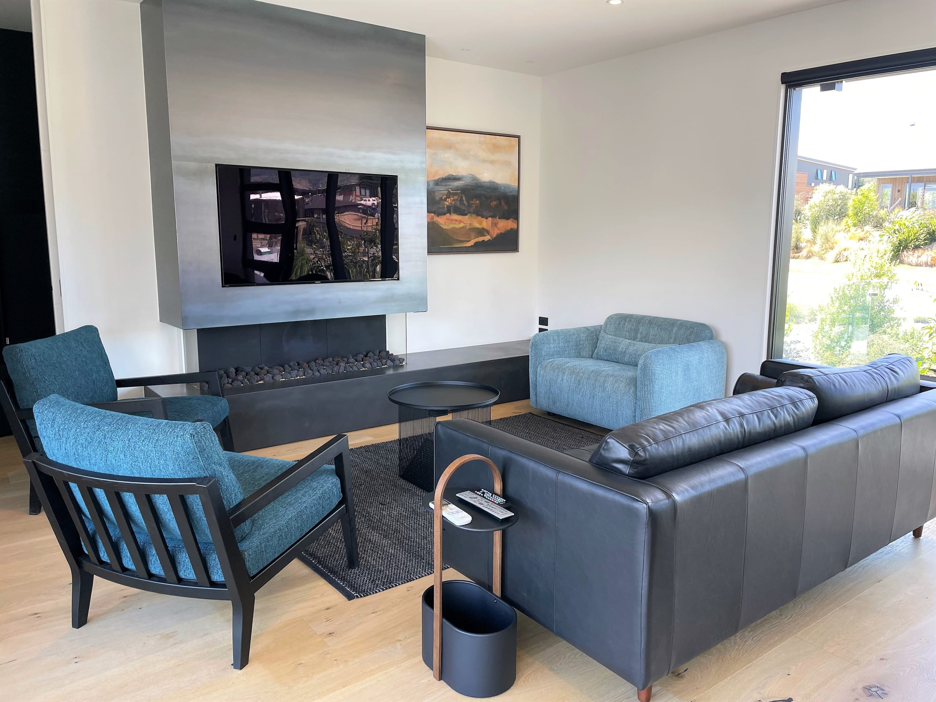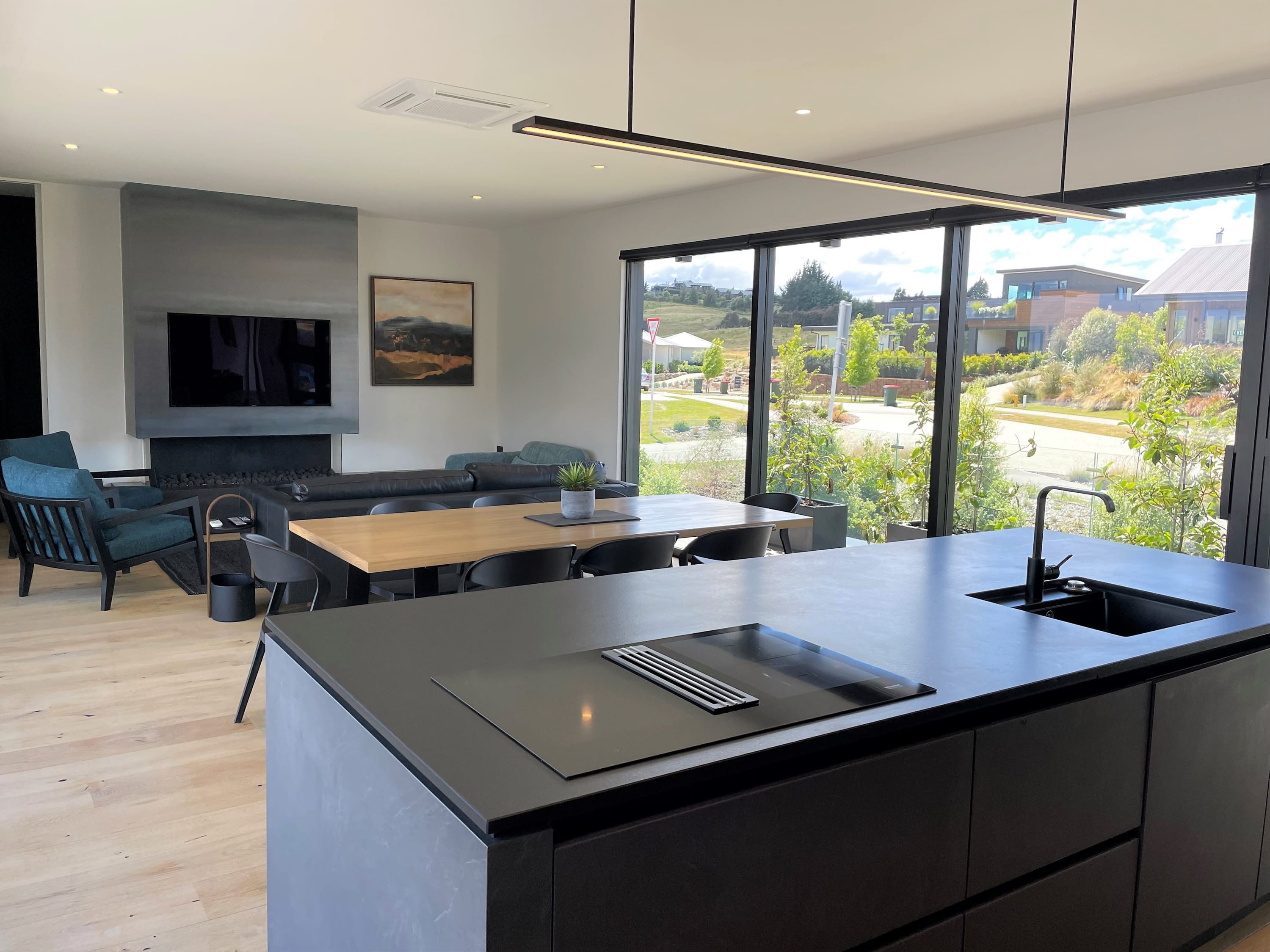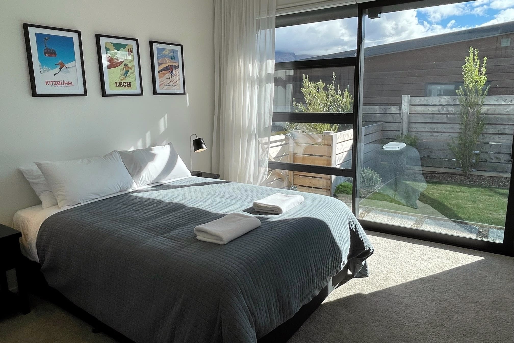 Upon entering the upper level, you'll be greeted by a seamlessly designed kitchen and an open lounge featuring a large smart TV and an inviting gas fire. This space opens up to a fabulous outdoor deck, providing a picturesque backdrop of the lake and mountains. Tucked away behind the lounge, a stunning powder room adds to the convenience. Moving to the lower level through the entrance, you'll discover three contemporarily styled bedrooms that open up to the garden. The shared bathroom boasts a deluxe bathtub, offering a perfect retreat after a day on the slopes or the lake. The master bedroom, situated strategically for optimal indoor-outdoor flow, features ranch sliders on both sides, a spacious ensuite, and a walk-in wardrobe.