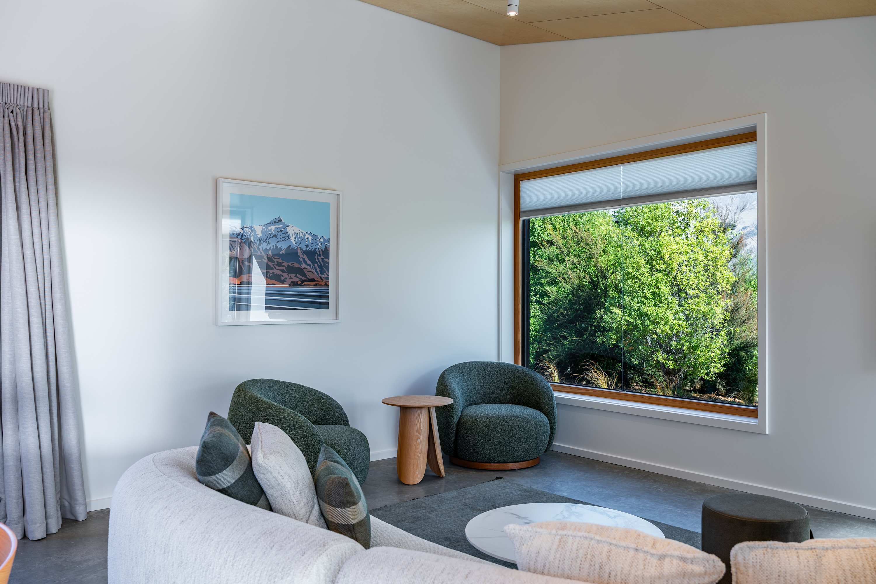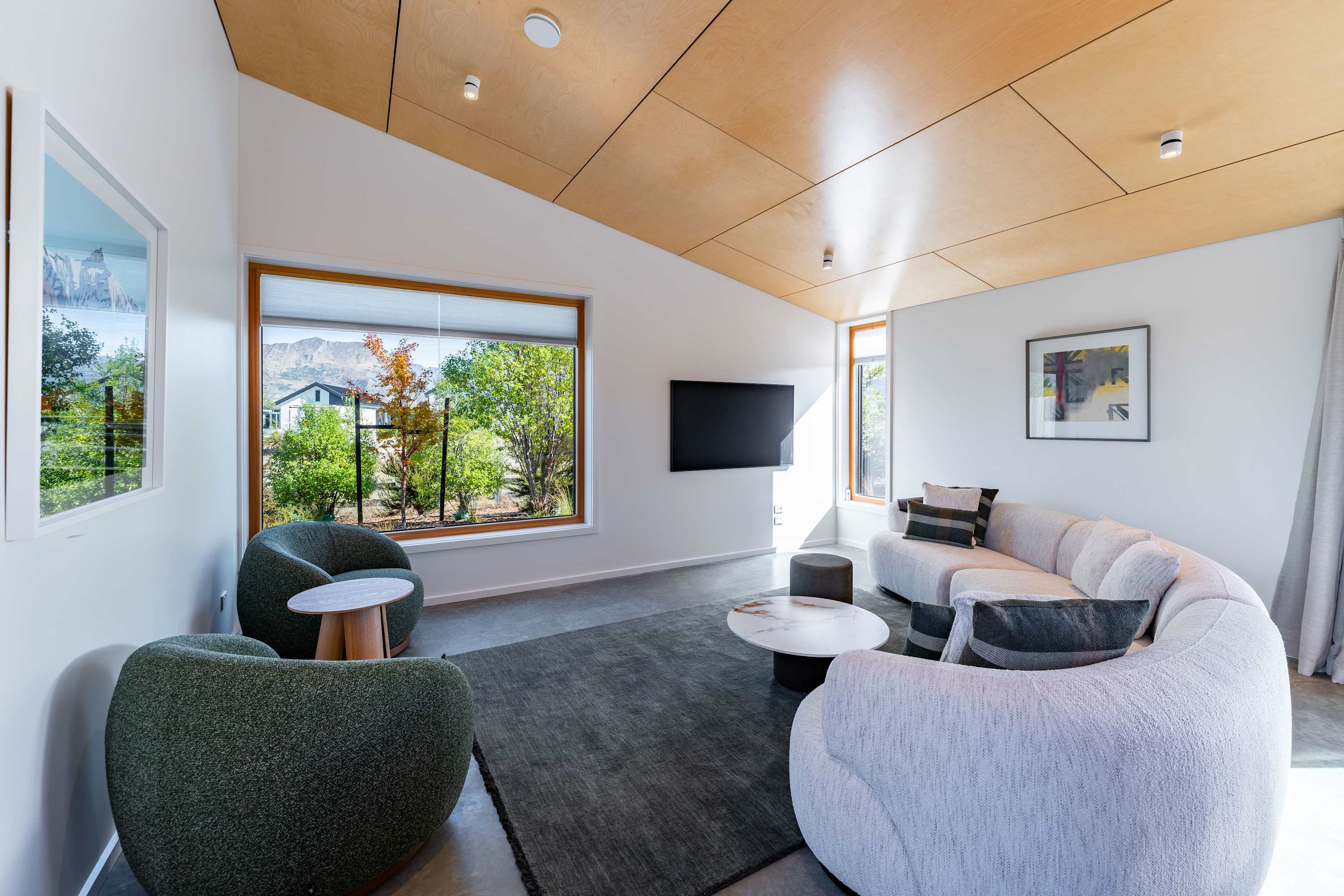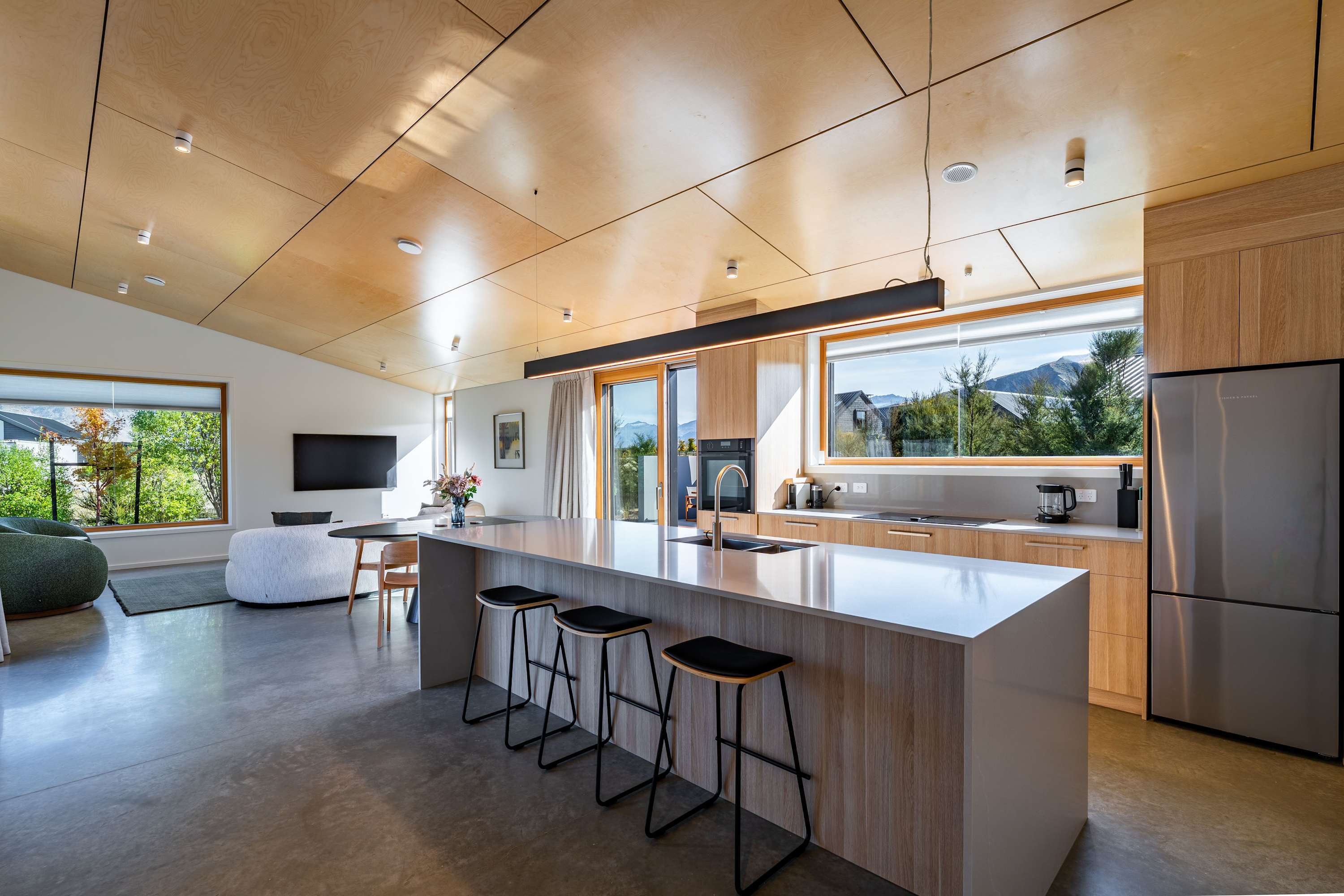 Step inside and be greeted by a light-filled, open-plan living space with soaring ceilings and warm timber detailing. The lounge is thoughtfully styled with plush seating, creating the perfect place to unwind in front of the Smart TV or simply relax after a day exploring Wanaka.