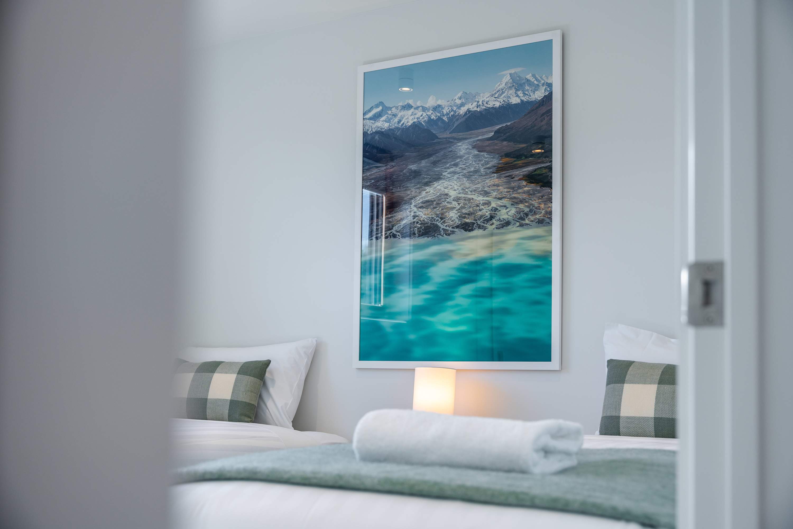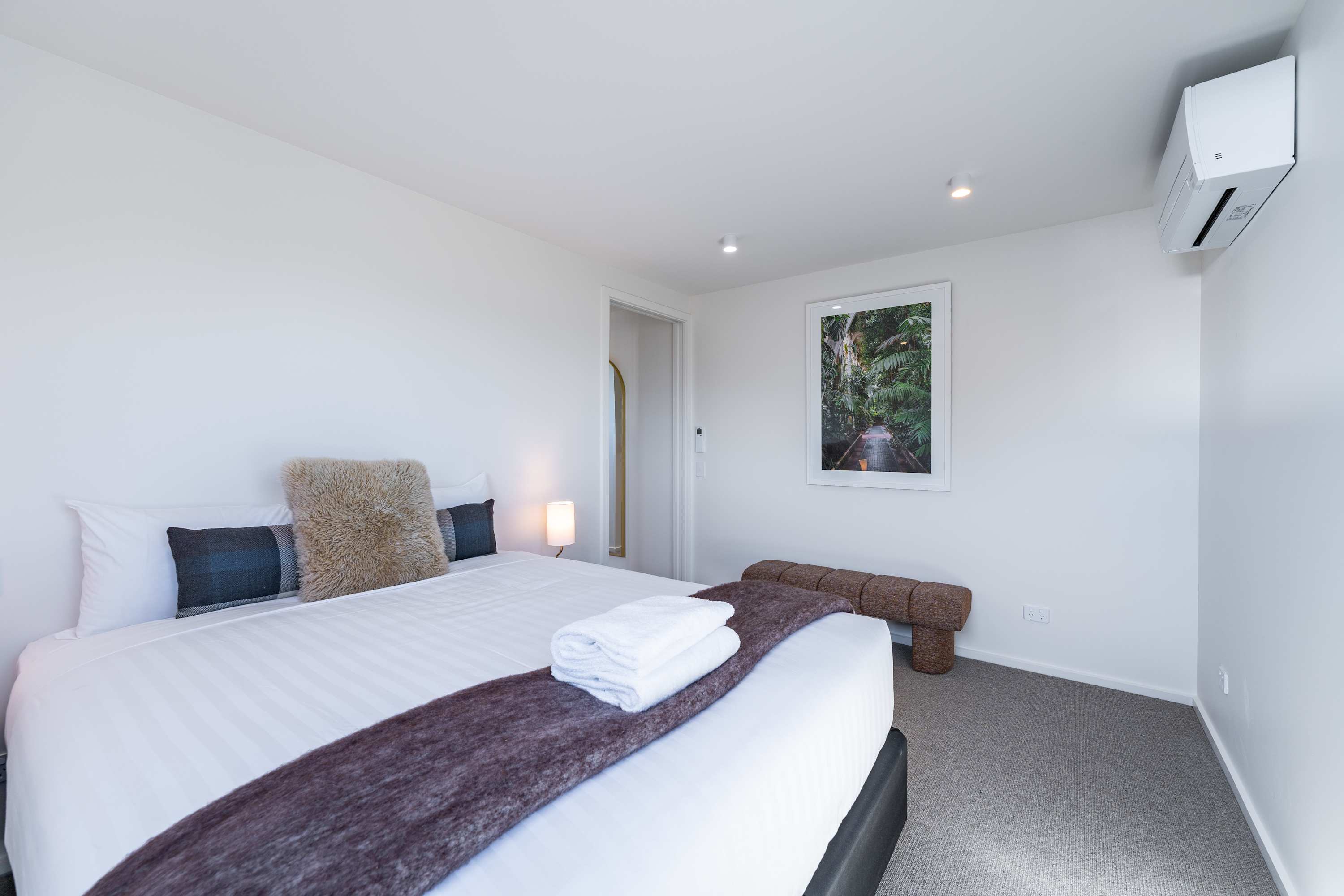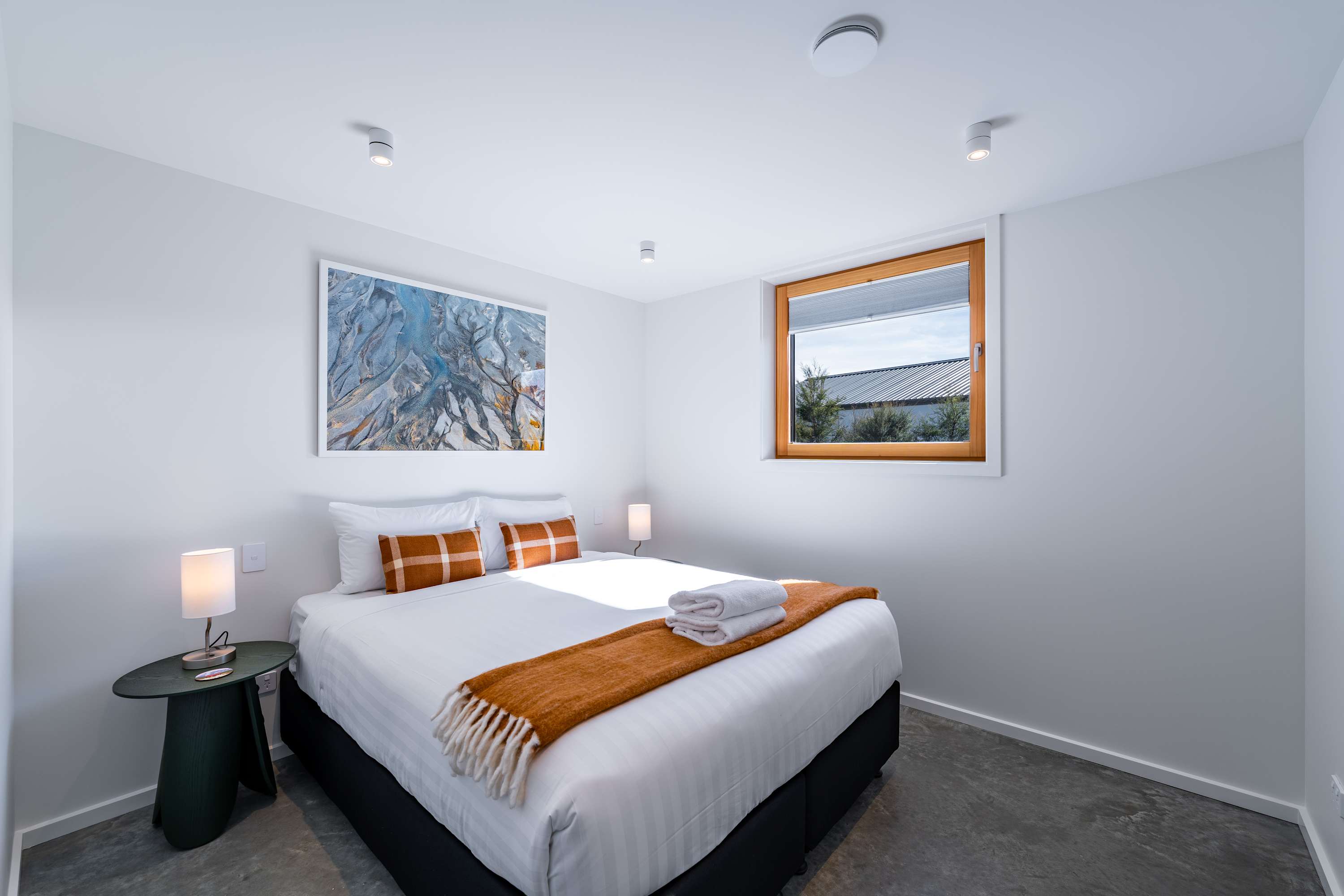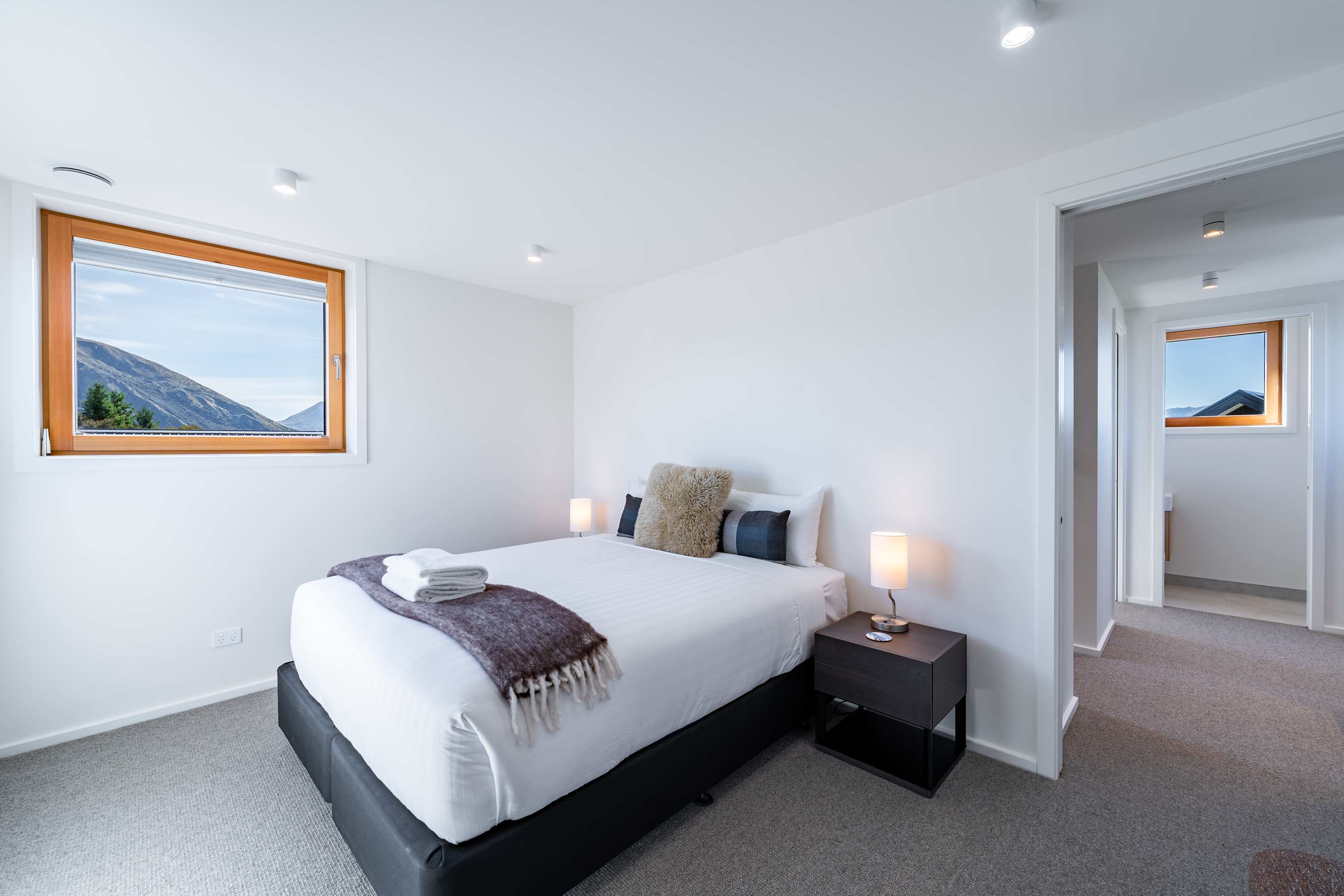 Step inside and be greeted by a light-filled, open-plan living space with soaring ceilings and warm timber detailing. The lounge is thoughtfully styled with plush seating, creating the perfect place to unwind in front of the Smart TV or simply relax after a day exploring Wanaka.